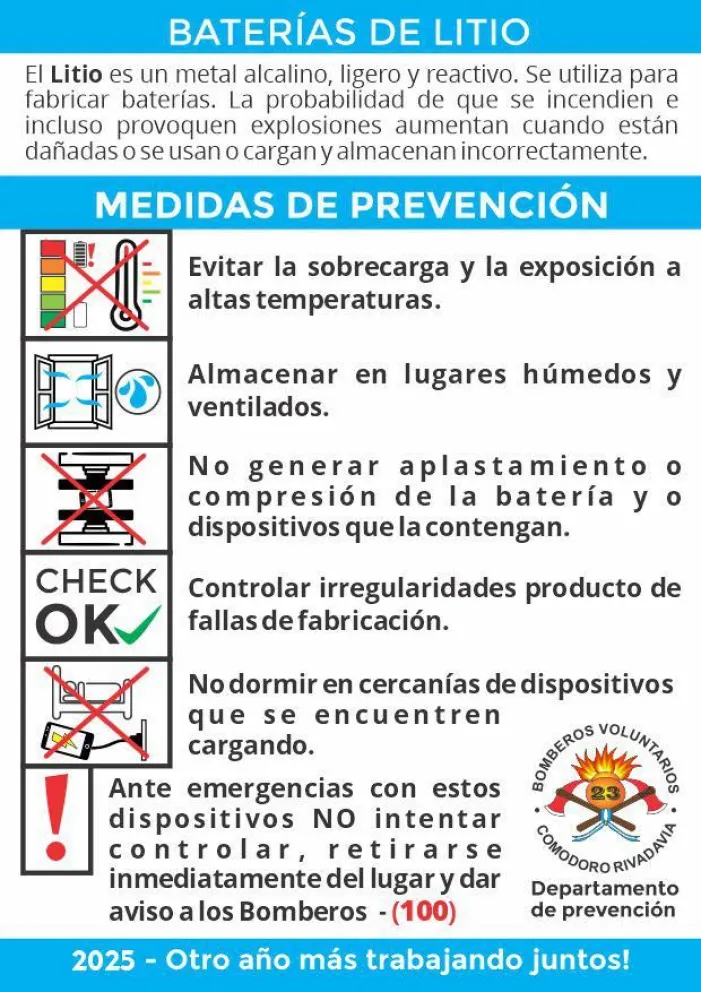Heredia recordó un caso en Puerto Madryn, donde un incendio provocado por la batería de un celular dañado generó una nube tóxica, obligando a evacuar una escuela y sus alrededores. “Los incendios de baterías de litio son distintos a otros; producen gases tóxicos y pesados que requieren una intervención especializada”, explicó. En caso de que una batería se incendie o explote, recomienda abandonar el lugar inmediatamente, evitar inhalar los gases y contactar a los bomberos.