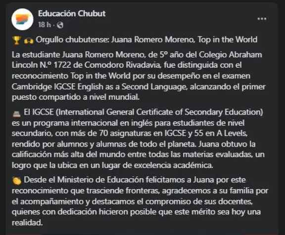 La joven comodorense alcanzó la calificación más alta del mundo en una de las evaluaciones más exigentes del sistema educativo internacional. El IGCSE (International General Certificate of Secondary Education) es un programa reconocido globalmente que cuenta con más de 70 asignaturas y se rinde en miles de escuelas alrededor del planeta.