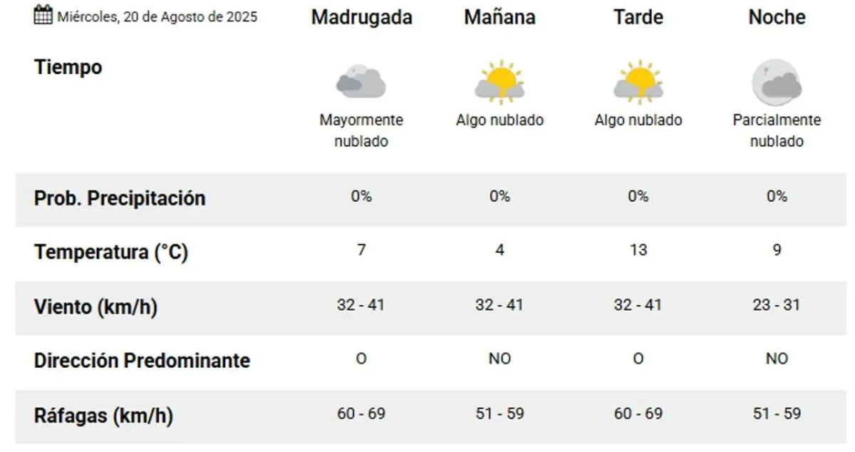 Durante la madrugada, la temperatura se ubicará en 7°C, con ráfagas del sector oeste que alcanzarán entre 60 y 69 km/h y un cielo mayormente nublado, aunque se descartan lluvias. En la mañana, la mínima descenderá a 4°C con algo de sol y una leve disminución en la intensidad del viento, que soplará entre 51 y 59 km/h.