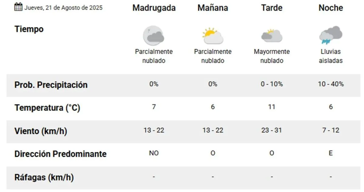 Para el jueves, el SMN anticipa una jornada sin viento y la posibilidad de lluvias aisladas al final del día. La mañana comenzará fresca con 6°C, aumentando a 11°C después del mediodía.