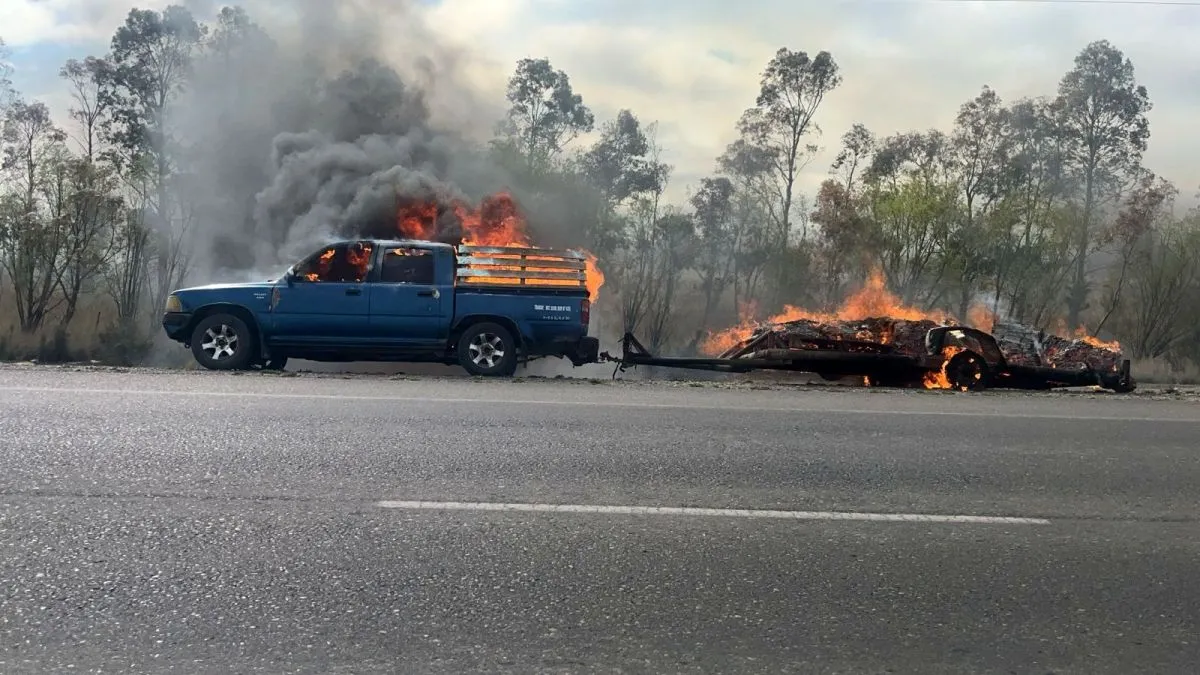 Se prendió fuego una camioneta que tiraba de un carro con cartones en la ruta 7 y originó voraz incendio en una chacra