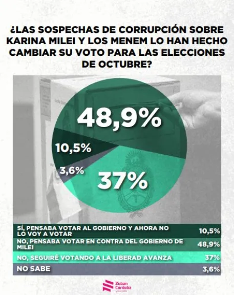 -Si bien un 37% asegura que seguirá apoyando a La Libertad Avanza a pesar de la crisis, y un 48,9% ya pensaba votar en contra del gobierno, el cambio de postura en el propio electorado libertario es un factor crítico. En un año electoral como este 2025, cualquier porcentaje, incluso un pequeño 3%, puede inclinar la balanza.