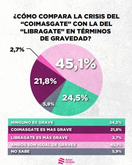 La situación actual se suma a una cadena de crisis anteriores, como el rechazo al veto a la ley de emergencia en discapacidad y el "libragate". El reciente "coimasgate" es percibido por la población encuestada como significativamente más grave. A diferencia del caso cripto, que resultó complejo de entender para la mayoría, las palabras "coimas" y "corrupción" resuenan directamente en la mente del "argentino o argentina de a pie", generando una indignación mucho más inmediata, señalan desde la consultora Zuban Córdoba y Asociados, autores del estudio. De hecho, un 45,1% de los encuestados considera que el "coimasgate" es igual de grave que el "libragate".