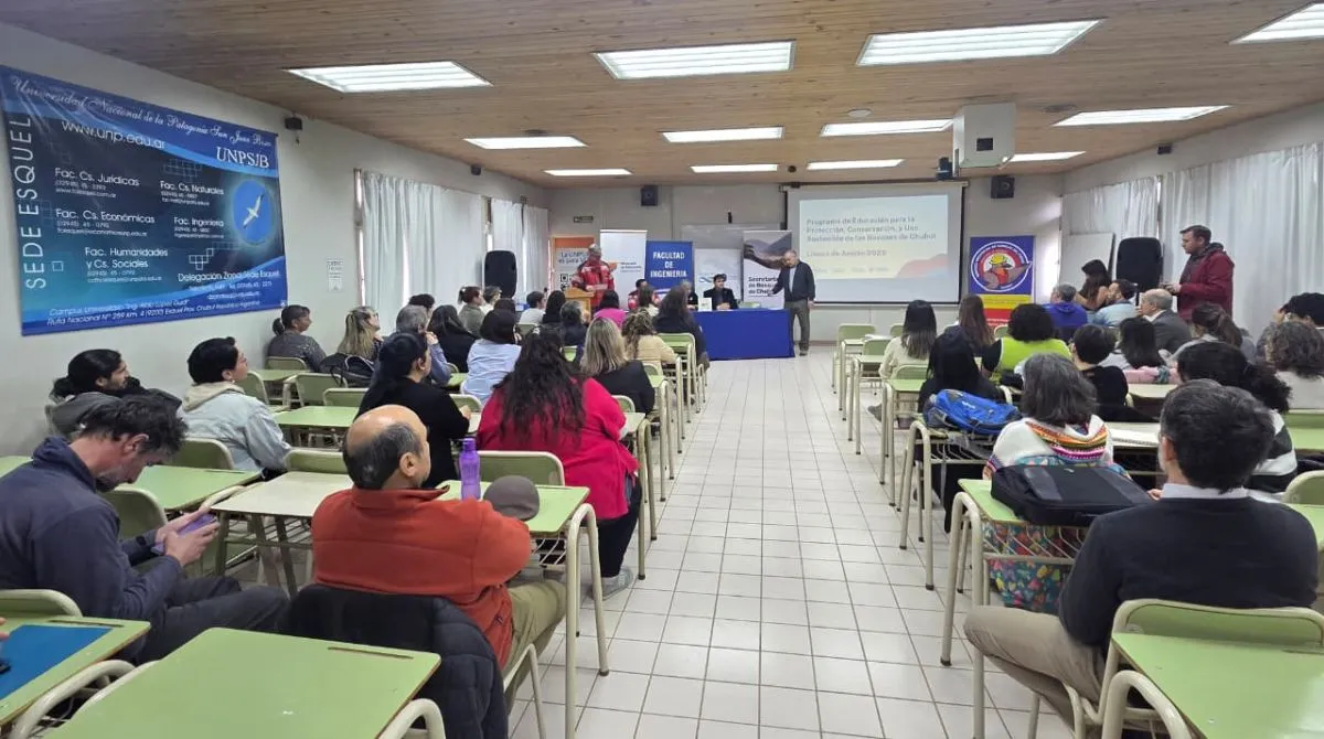 La jornada de trabajo se desarrolló este viernes en el Aula Magna de la Universidad Nacional de la Patagonia “San Juan Bosco”, con la participación de la subsecretaria de Instituciones Educativas, Adriana Di Sarli; autoridades de la cartera de Bosques chubutense; referentes de la casa de altos estudios; docentes y directivos de establecimientos escolares de la zona.
