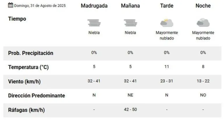 Para este domingo, se anticipan neblinas, abundante nubosidad y temperaturas frías. Durante la madrugada, la temperatura mínima será de 5°, acompañada de alta humedad y visibilidad reducida debido a la niebla.