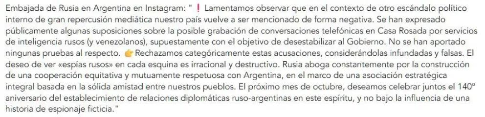 "Se han expresado públicamente algunas suposiciones sobre la posible grabación de conversaciones telefónicas en Casa Rosada por servicios de inteligencia rusos (y venezolanos), supuestamente con el objetivo de desestabilizar al Gobierno. No se han aportado ningunas pruebas al respecto", enfatizó.
