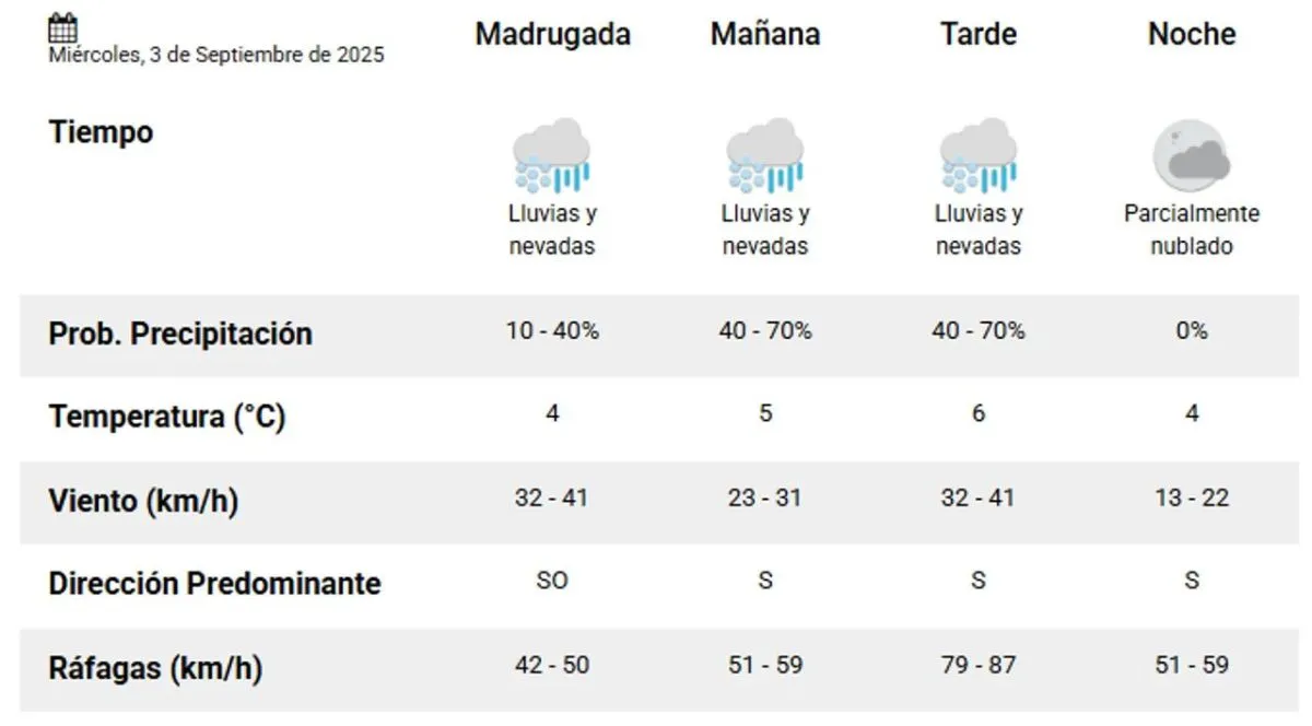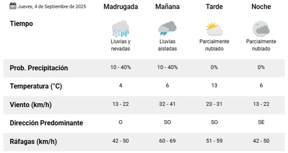Desde la madrugada, la temperatura mínima será de 4°, con ráfagas del sudoeste de 42 a 50 km/h. Por la mañana, la temperatura subirá a 5° y el viento alcanzará casi 60 km/h.