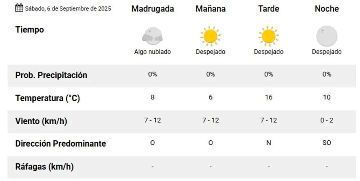 En horas de la madrugada la temperatura comenzará en 8°C con cielo algo nublado, que se despejará por completo hacia la mañana, alcanzando una mínima de 6°C.