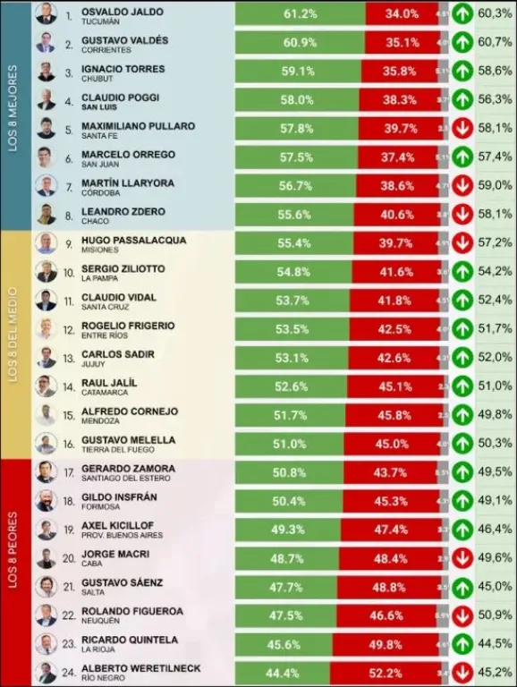 El estudio de septiembre sitúa a Torres justo por detrás de Osvaldo Jaldo de Tucumán, quien encabeza la lista con un 61,2% de imagen positiva, y Gustavo Valdés de Corrientes, que ocupa el segundo lugar con un 60,9% de aprobación. Esta posición resalta la fuerte valoración que los ciudadanos de Chubut y la población general encuestada tienen sobre su gestión.