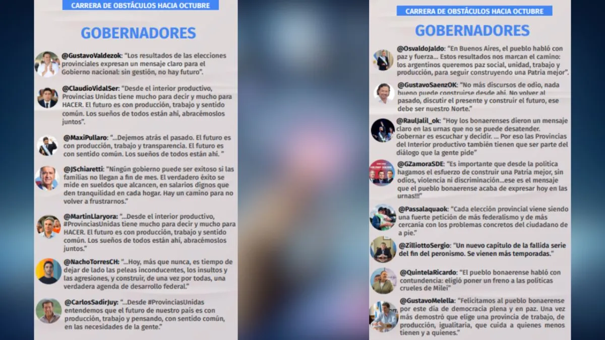 Gobernadores y personalidades políticas de diversas provincias emitieron mensajes con un eje común. Ignacio "Nacho" Torres pidió "dejar de lado las peleas inconducentes, los insultos y las agresiones, y construir, de una vez por todas, una verdadera agenda de desarrollo federal". Gustavo Valdez manifestó que los resultados electorales "expresan un mensaje claro para el Gobierno nacional: sin gestión, no hay futuro". Juan Schiaretti señaló que "el verdadero éxito se mide en sueldos que alcancen, en salarios dignos que den tranquilidad en cada hogar". En el ámbito peronista, Juan Grabois afirmó que "el pueblo bonaerense se jugó por la democracia" y que se "aplastó la prepotencia del poder". Carli Bianco (Ministro de Gobierno de Kiciloff) sostuvo que "los bonaerenses reconocen y valoran la gestión del gobierno de la Provincia" y que le "dijeron basta a Milei".