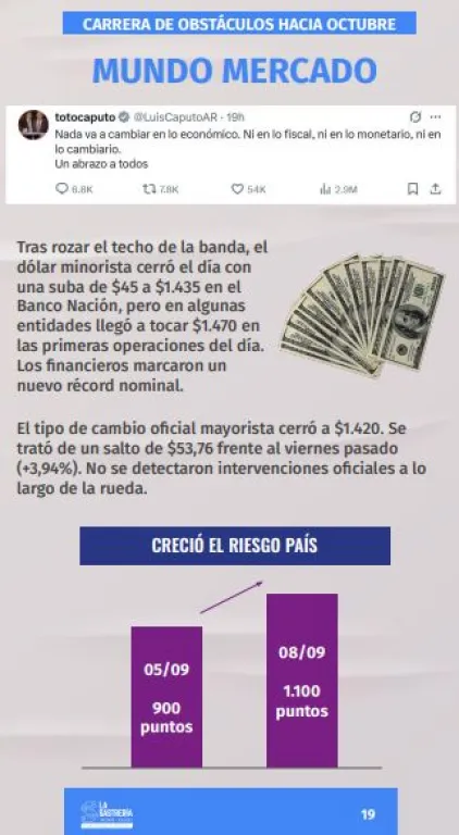 Por otro lado, en el plano económico, el esquema cambiario y monetario se verá desafiado si el dólar alcanza la banda superior. Un incremento del dólar podría trasladarse a precios y reactivar la inflación. La tasa de interés, alta para contener que los pesos no se dirijan al dólar, puede agravar la contracción productiva y consolidar una recesión. Un tercer obstáculo es la renovación de deuda del Estado con los bancos por 7,2 billones de pesos entre el 11 y el 13 de septiembre.