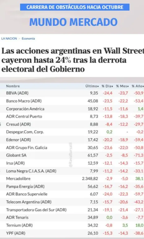 Respecto a las acciones de las empresas argentinas, el lunes post elecciones se registraron importantes caídas en la bolsa, siendo un claro mensaje por parte de los mercados.