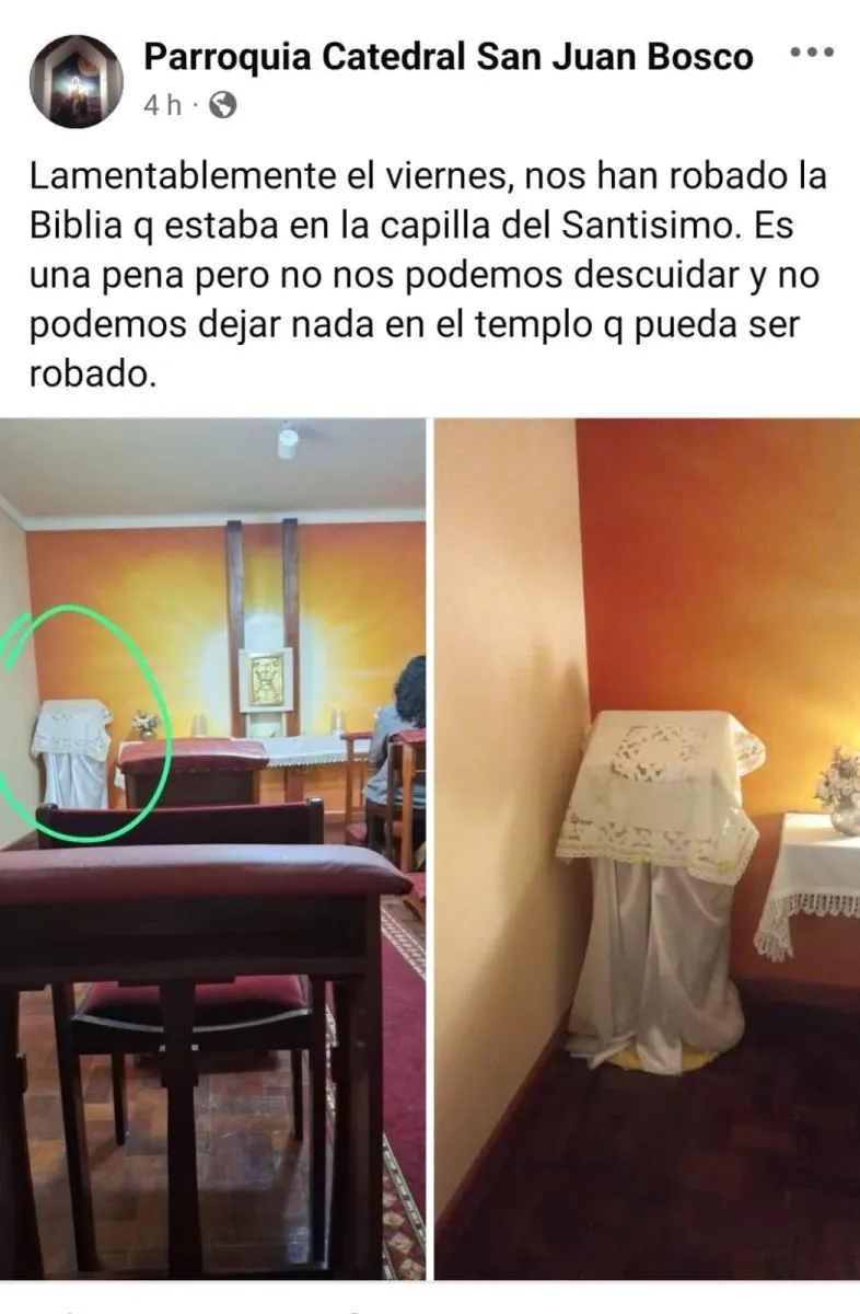 “Lamentablemente, el viernes nos han robado la Biblia que estaba en la capilla del Santísimo”, comunicaron. El mensaje se difundió rápidamente entre los fieles y despertó indignación y tristeza, dado que el hecho ocurrió en un espacio destinado a la oración y la reflexión.