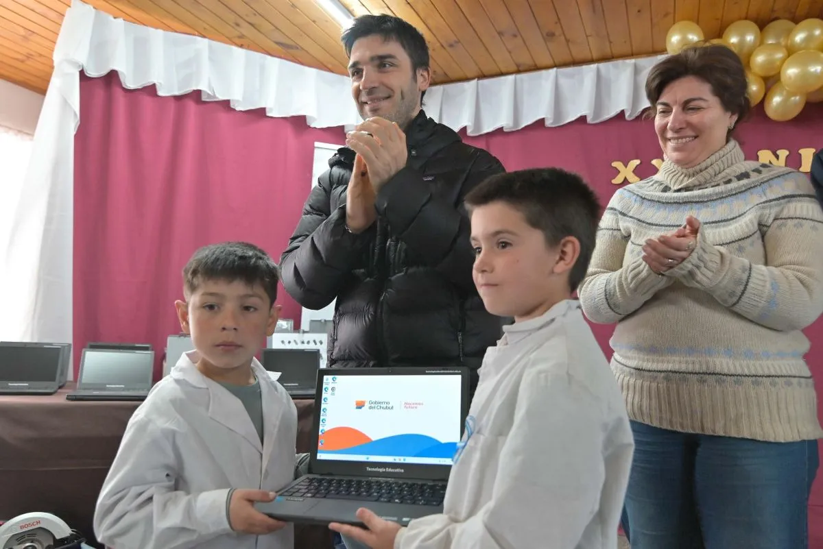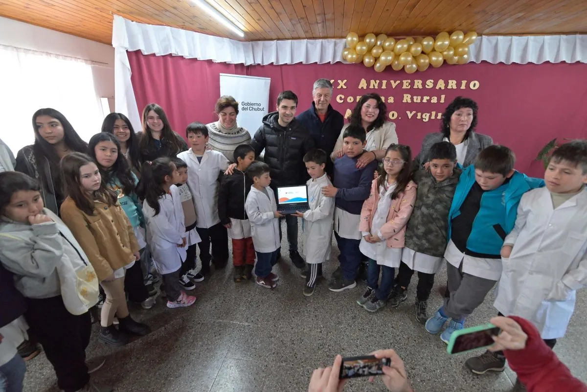 Durante la conmemoración por el 20° aniversario de la comuna, el titular del Ejecutivo chubutense realizó también la entrega de un Aula Digital Móvil y kits tecnológicos a la Escuela N° 97 “Albertano Lucio Castro” como parte del Programa de Fortalecimiento Tecnológico a Instituciones Educativas.