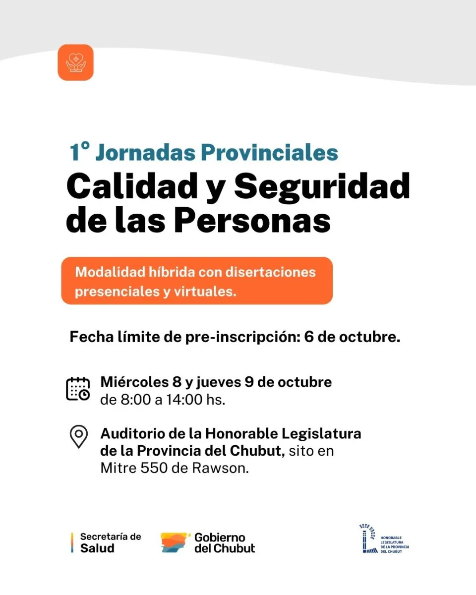 Con el propósito de continuar jerarquizando el sistema sanitario público, la gestión del gobernador Ignacio “Nacho” Torres, a través de la Secretaría de Salud, realizará en Rawson las “1º Jornadas Provinciales de Calidad y Seguridad de las Personas”.