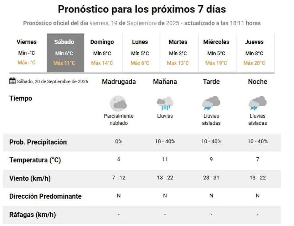 La jornada comenzará con un cielo mayormente nublado y temperaturas frescas alrededor de 5 °C en la mañana. A medida que avance el día, se anticipan lluvias, con temperaturas que podrían llegar hasta los 13 °C por la tarde.