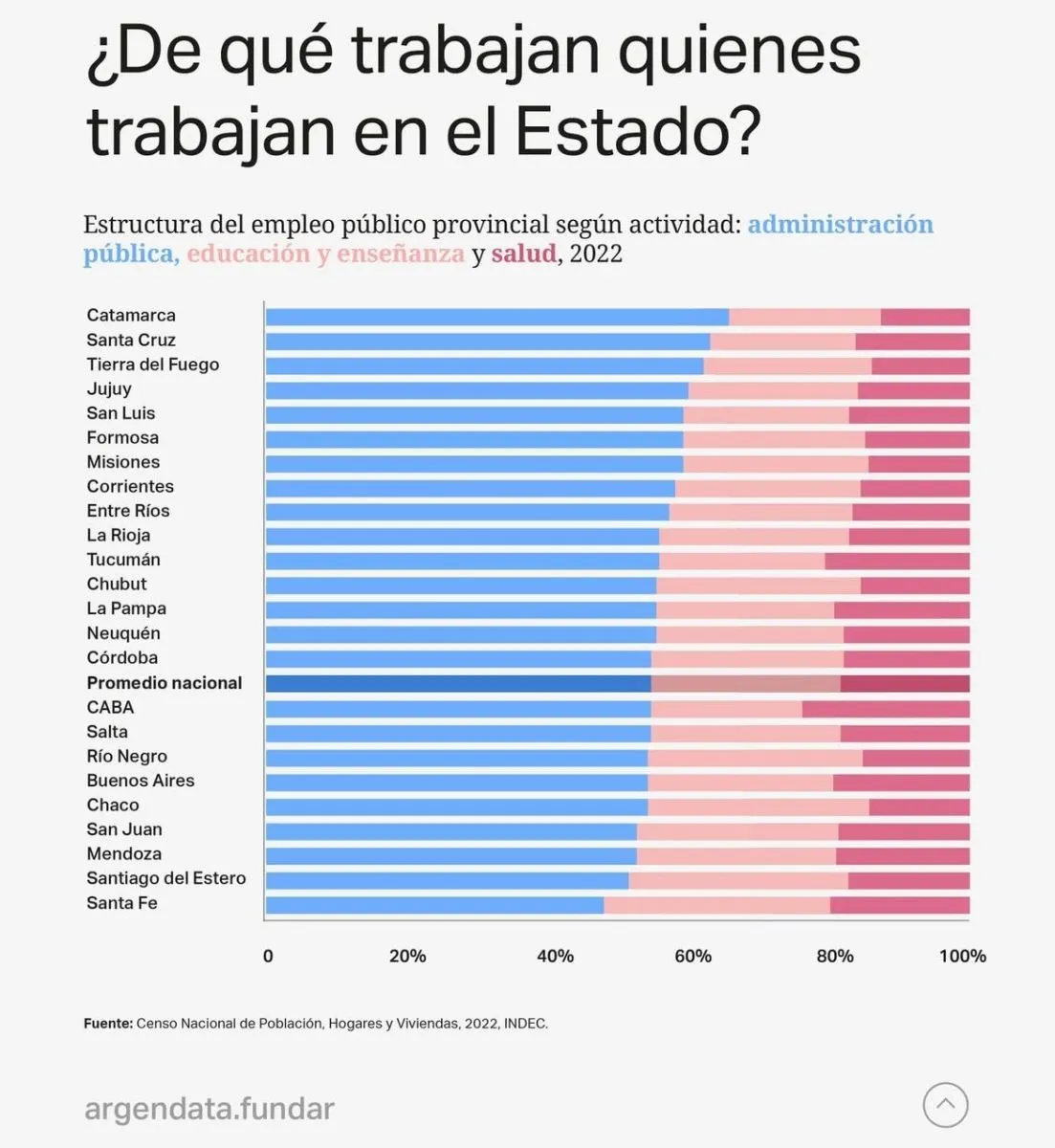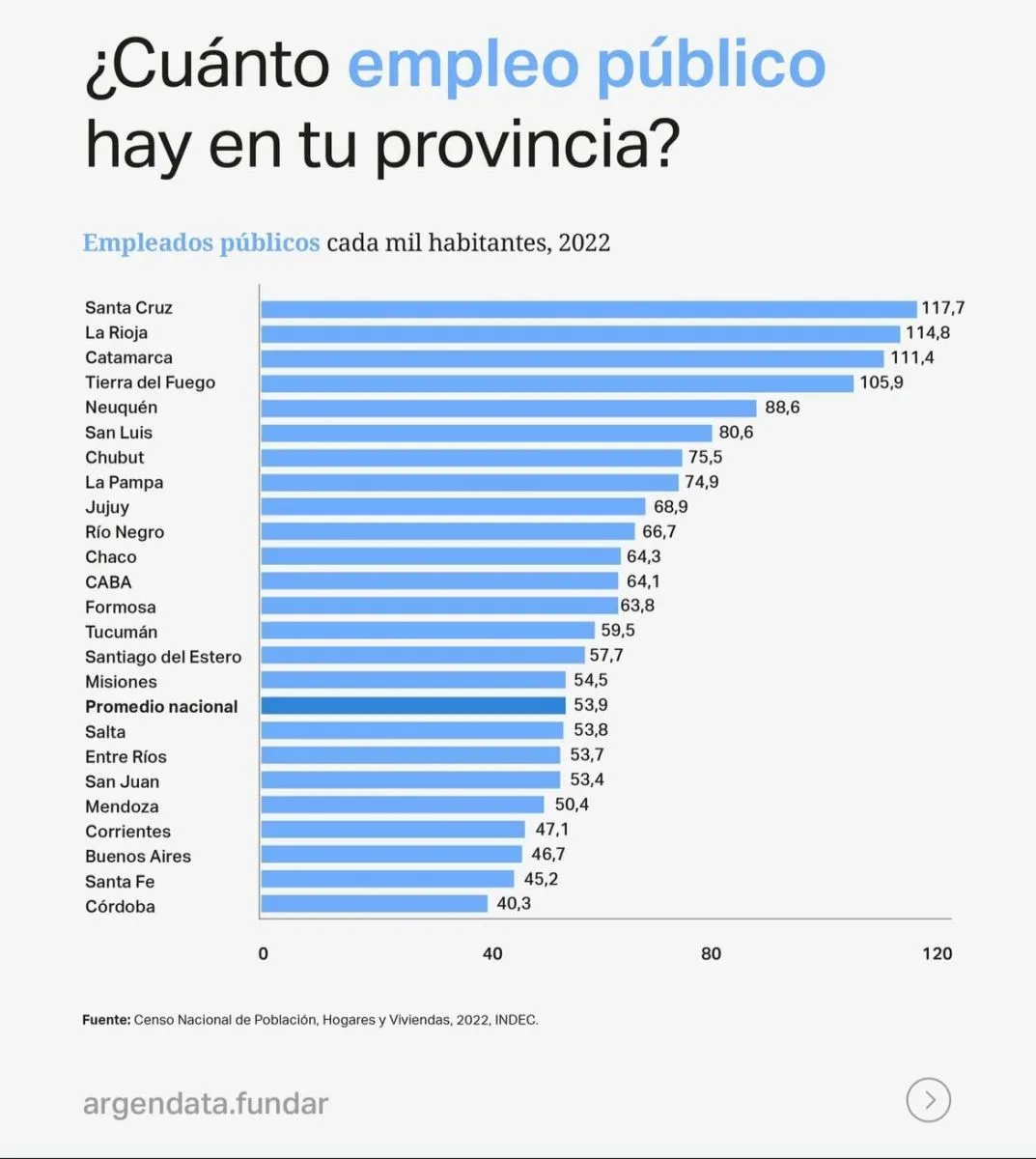 Santa Cruz encabeza la lista de provincias con mayor proporción de empleados estatales, con 117,7 trabajadores públicos por cada mil habitantes, según un informe de Argendata (Fundar) basado en datos del Censo Nacional 2022. Le siguen La Rioja, con 114,8, y Catamarca, con 111,4. El estudio señala que las provincias menos pobladas tienden a tener un mayor número de empleados públicos en relación con sus habitantes.
