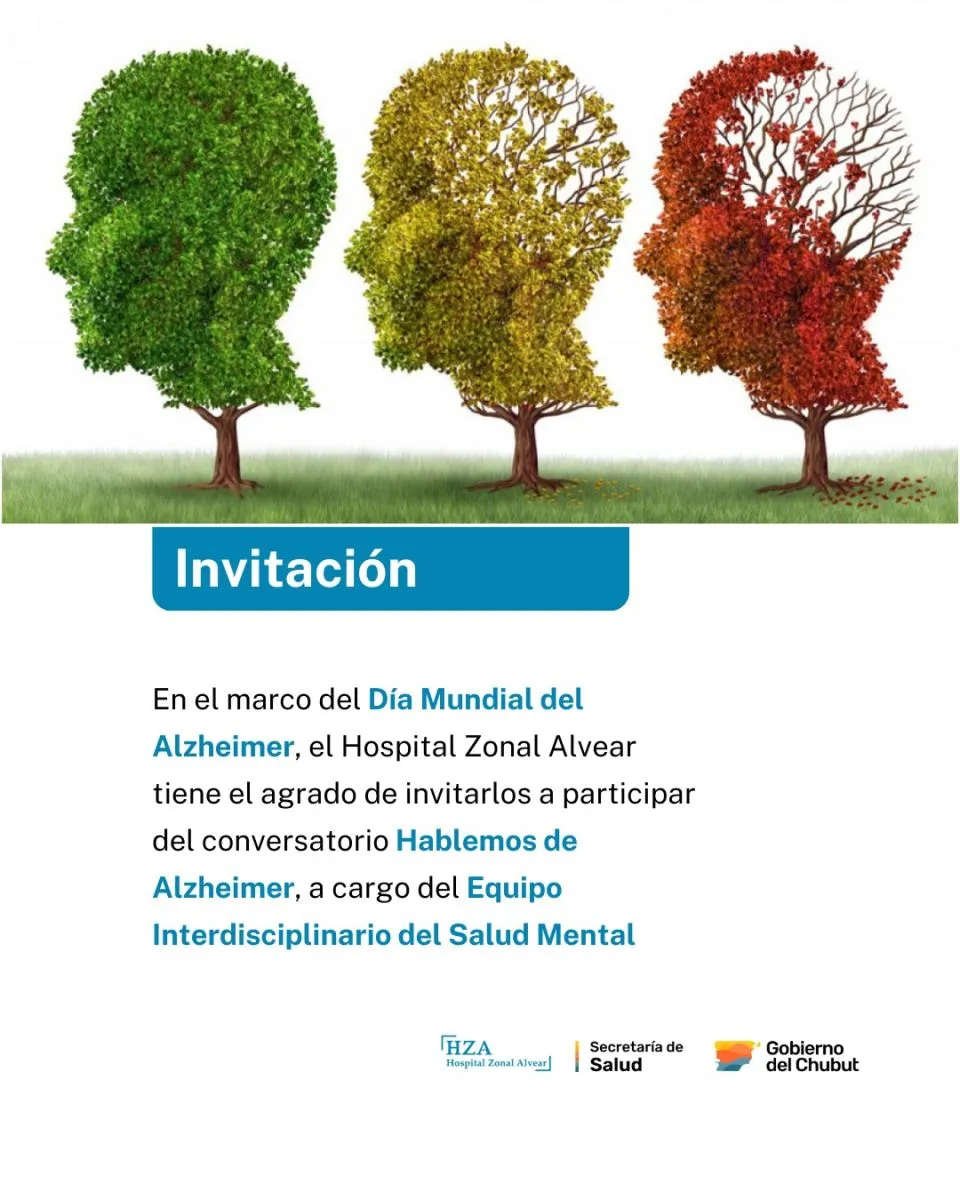 En ese marco, el equipo interdisciplinario de Salud Mental del Hospital Zonal Alvear realizará el conversatorio “Hablemos de Alzheimer”, abierto a familiares y comunidad en general. La actividad será el lunes 29 de septiembre de 10:00 a 12:00 hs en el Auditorio del Hospital, ubicado en Juan Ramón Balcarce 1240 de barrio General Mosconi.