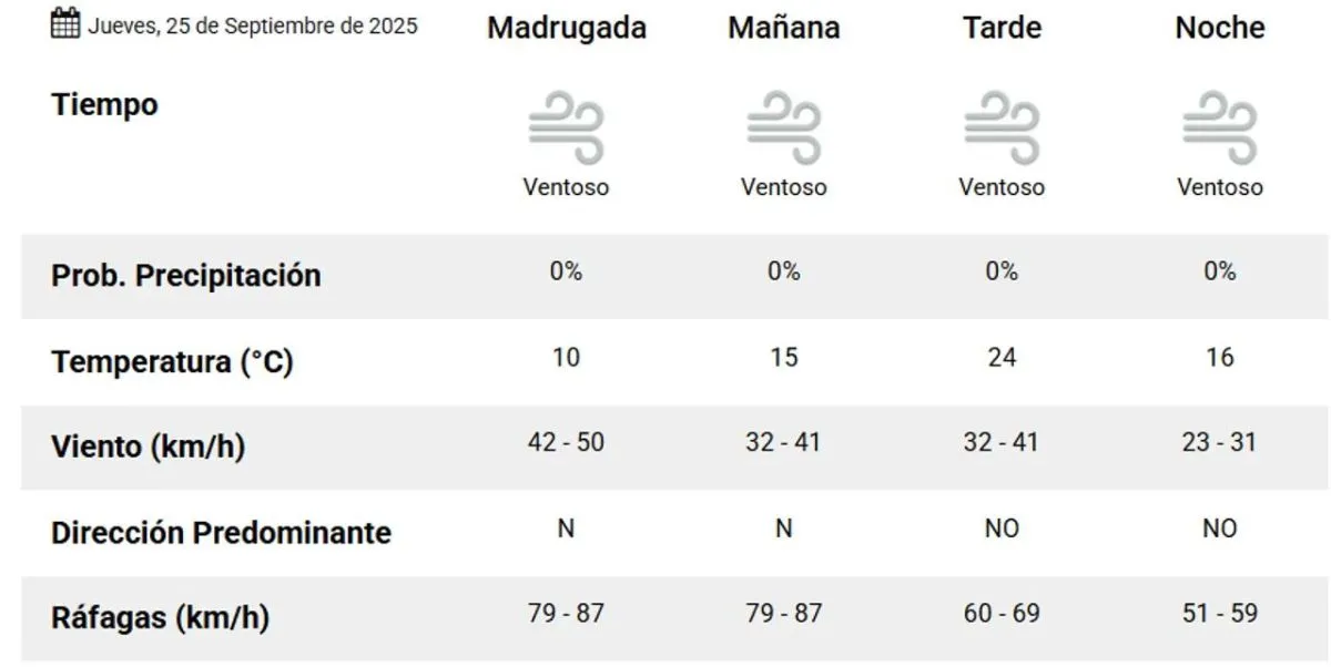 Por la noche, se prevé un descenso a 16°C, con ráfagas fuertes que podrían llegar a los 80 km/h, nuevamente del noreste.