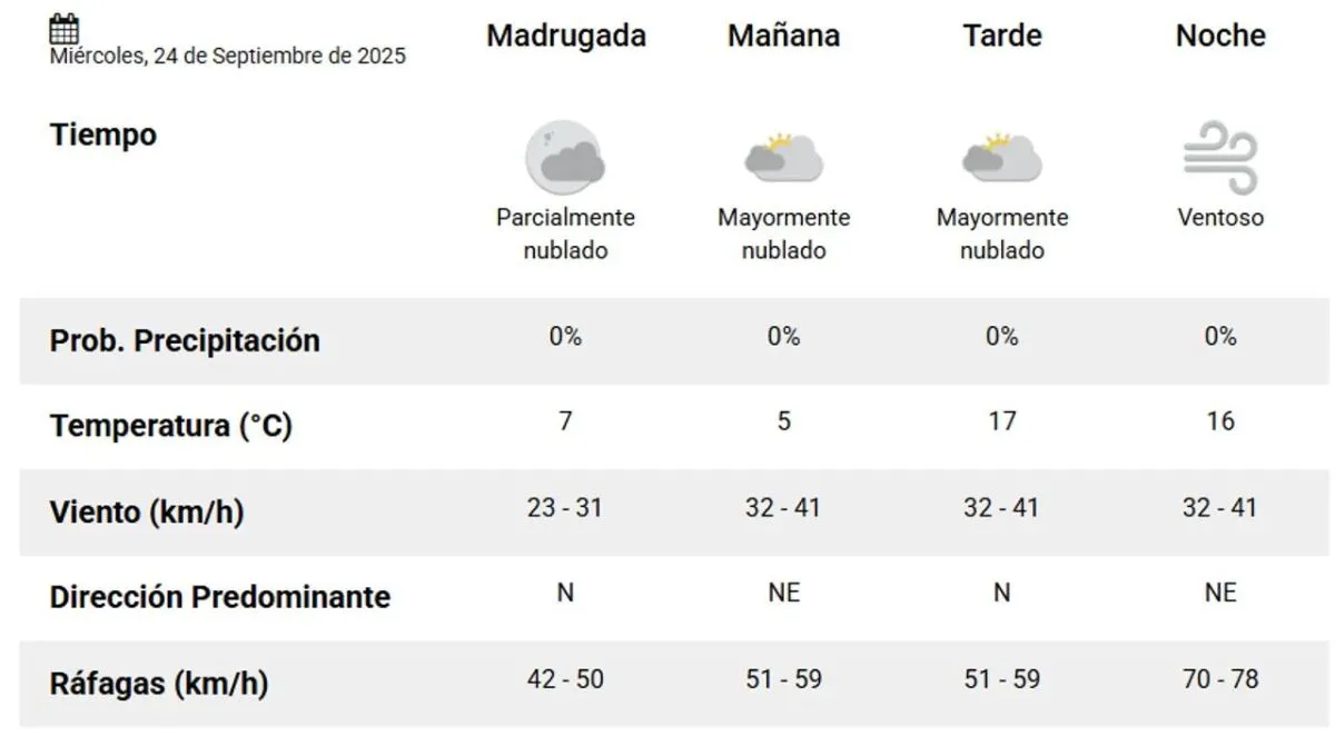 Desde la madrugada, el cielo se presentará parcialmente nublado con una temperatura de 7°C y ráfagas leves del norte, alcanzando los 42 y 50 km/h.
