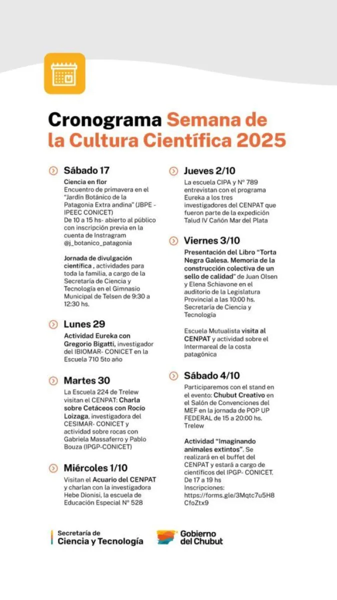 El calendario completo y el detalle de cada actividad estarán disponibles en el sitio web oficial de la Secretaría de Ciencia y Tecnología: ciencia.chubut.gov.ar y en sus redes sociales.