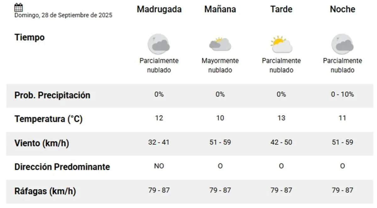 En Comodoro Rivadavia y Rada Tilly, el domingo comenzará con temperaturas alrededor de 12°, un cielo parcialmente nublado y ráfagas intensas del noroeste, que oscilarán entre 79 y 87 km/h.