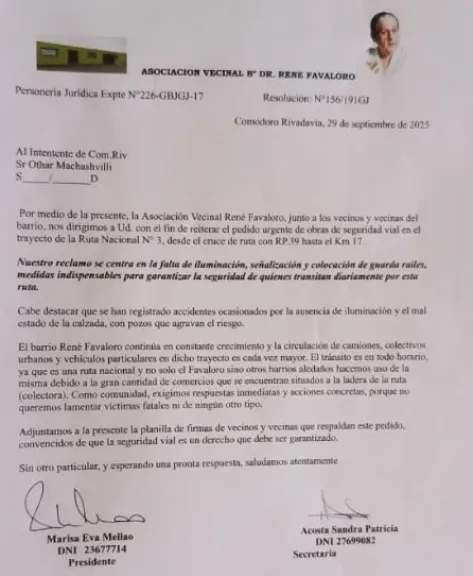 En los comercios se puede encontrar una nota que hizo la Vecinal del barrio René Favaloro, que propone la juntas de firmas de los vecinos para exigir obras viales sobre la ruta 3 y la colectora. Reclaman semáforos, sendas peatonales, iluminación, demarcación y rotondas de acceso a la ruta, como así también la colocación de un guardrail.