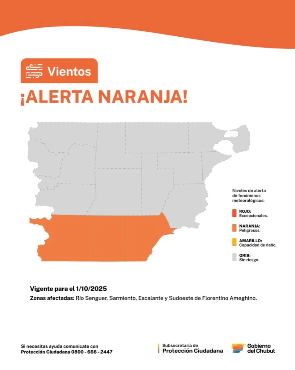 Este lunes a la tarde el Servicio de Protección Ciudadana a de la provincia del Chubut informó a la población que el Servicio Meteorológico Nacional emitió un "alerta naranja" para el 1° de octubre en la zona sur de la provincia del Chubut y zona norte de Santa Cruz.