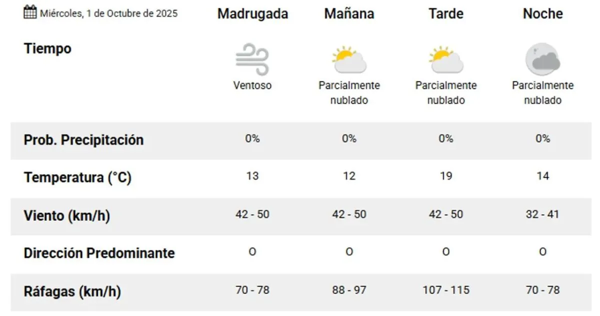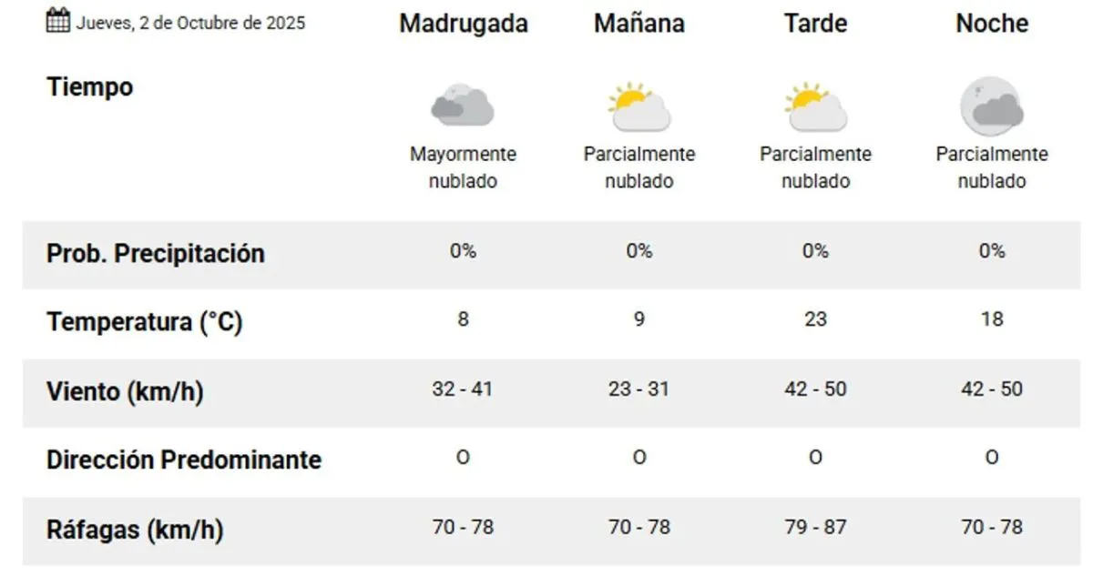 Desde la madrugada, las temperaturas comenzarán en torno a los 13°C, con vientos que soplarán del oeste a velocidades de entre 70 y 78 km/h.