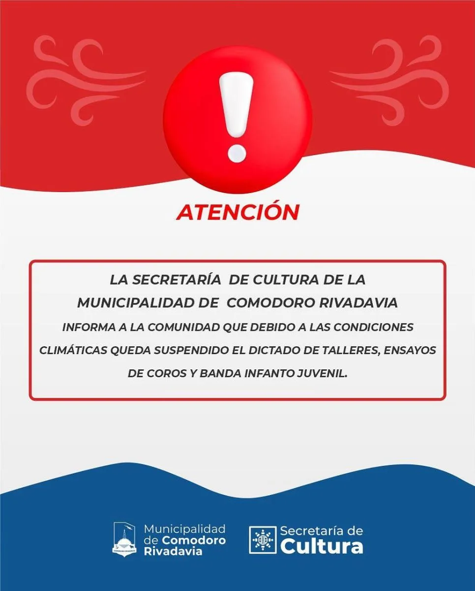 En el marco del alerta naranja por fuertes vientos que rige para Comodoro Rivadavia, la Secretaría de Cultura municipal comunicó la suspensión de todas las actividades programadas para este miércoles.