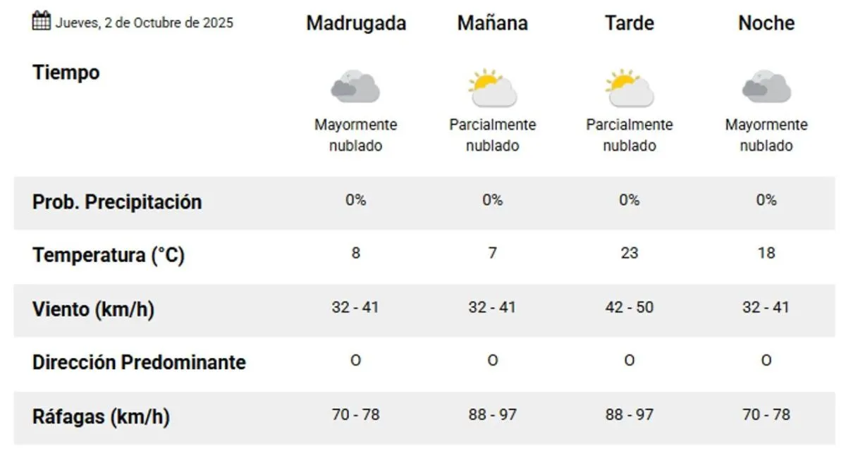 Desde la madrugada, la temperatura se ubicará en torno a los 8°C, con cielo muy nublado. Aunque no se esperan lluvias, el viento será fuerte, soplando a velocidades de entre 70 y 78 km/h desde el oeste.
