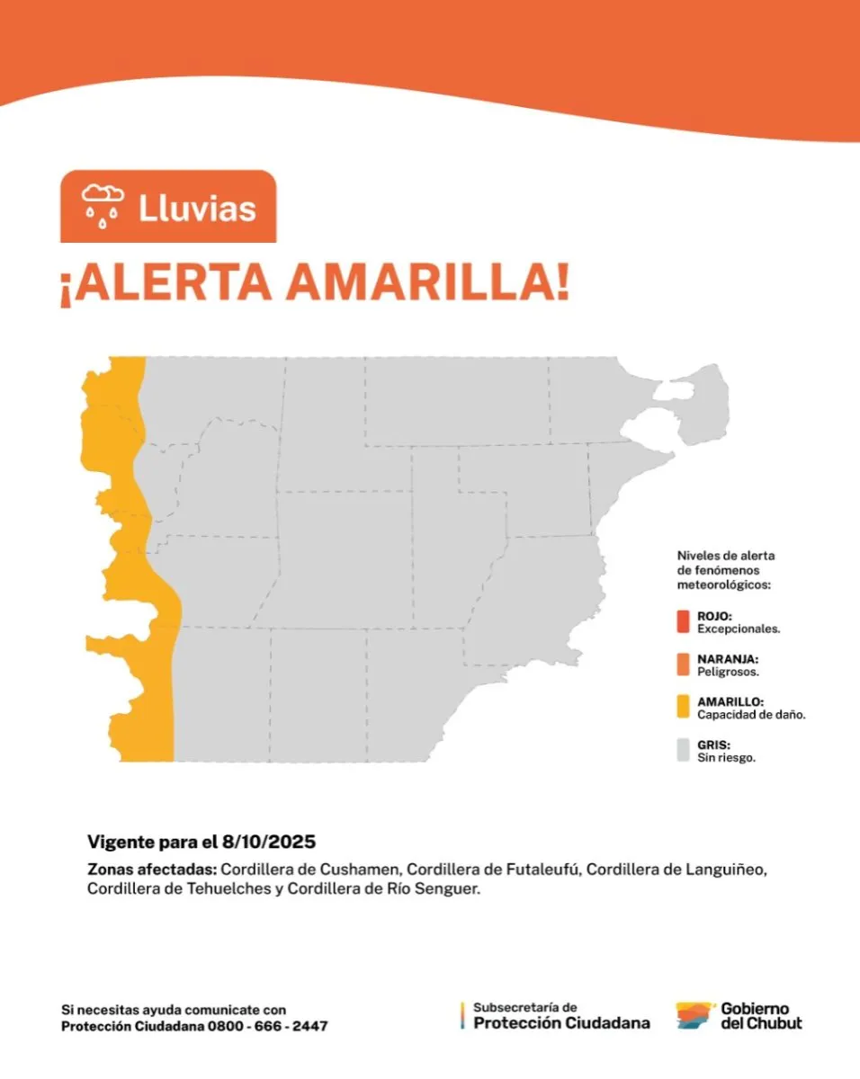 Y para la zona de la Cordillerana de Cushamen, Futaleufú, Languiñeo, Tehuenches y Río Senguer, se anuncia alerta amarilla por fuertes lluvias también para el día miércoles.