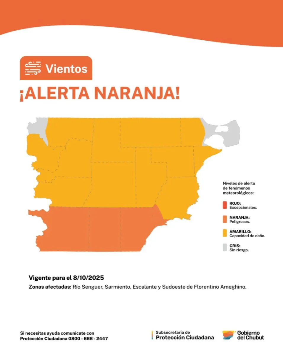 El alerta también fue comunicado por la Subsecretaria de Protección Ciudadana del gobierno del Chubut, que informó que las zonas afectadas serán Río Senguer, Sarmiento, Escalante y Sudoeste de Florentino Ameghino.