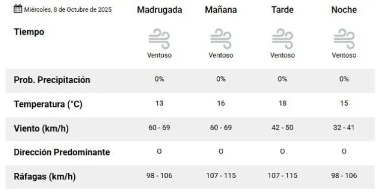 La jornada comenzará con una mínima de 13°, acompañada de vientos provenientes del oeste que oscilarán entre 98 y 106 kilómetros por hora. A medida que avance la mañana, se espera un aumento en la velocidad del viento, alcanzando entre 107 y 115 km/h, lo que elevará la temperatura a 16°.