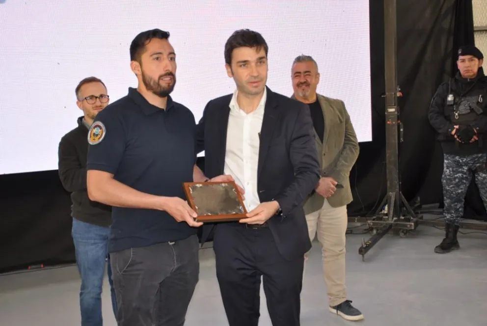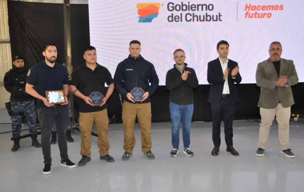 El gobernador de la provincia del Chubut, Ignacio Torres, junto al ministro de Seguridad, Héctor Iturrioz, y el secretario de gobierno del Chubut, Victoriano Eraso Parodi, destacó a los policías de la División Sustracción Automotores que participaron de los distintos operativos de recupero de vehículos en las causas de corrupción de la provincia del Chubut.