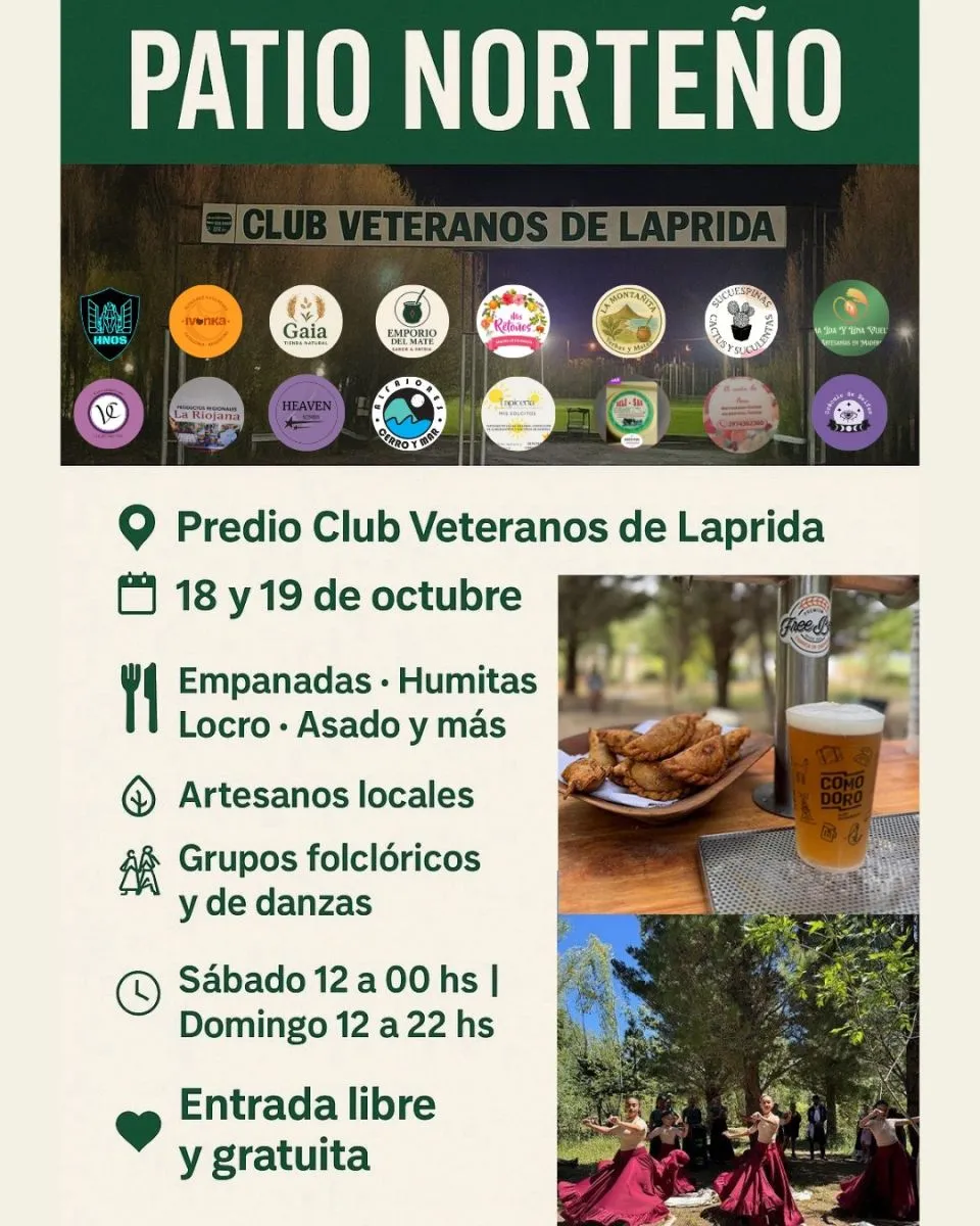 Este sábado y domingo se realizará por primera vez el Patio Norteño en el Club de Veteranos del barrio Laprida. La primera jornada será de 12 a 00 horas y la segunda de 12 a 22.