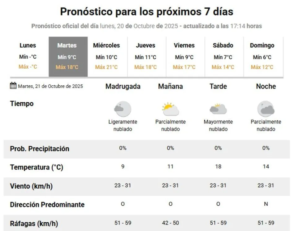 A lo largo del día, se prevé que el cielo se cubra gradualmente, mientras los vientos del oeste soplarán con ráfagas que alcanzarán los 59 km/h.