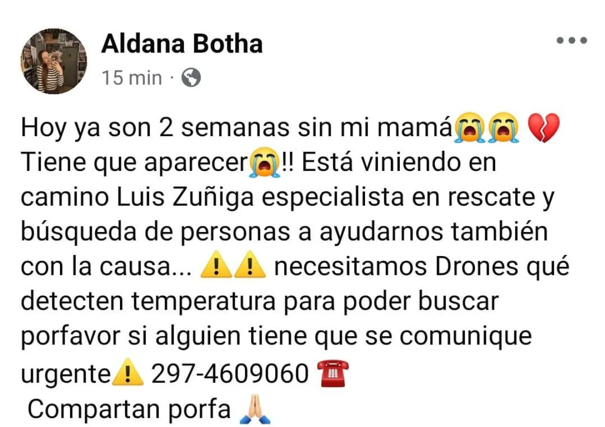“Hoy ya son dos semanas sin mi mamá. Tiene que aparecer. Está viniendo Luis Zuñiga, especialista en rescate y búsqueda de personas, a ayudarnos con la causa. Necesitamos drones que detecten temperatura para poder buscar. Por favor, si alguien tiene, comuníquese urgente al 297-4609060”.