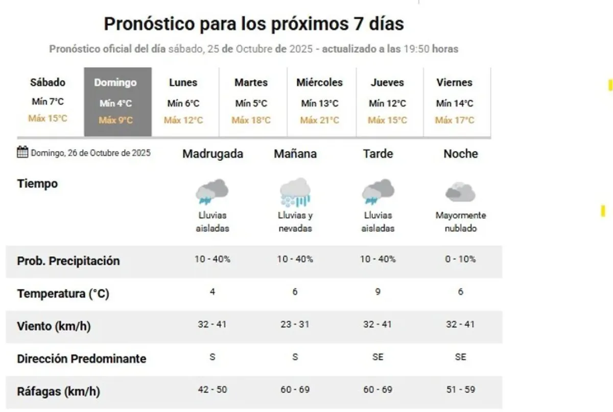 De cara al inicio de la próxima semana, el lunes traerá un leve alivio en las condiciones climáticas, con un día sin lluvias, cielo parcialmente nublado y temperaturas que oscilarán entre los 6 °C de mínima y los 12 °C de máxima. Sin embargo, el viento seguirá presente, especialmente por la noche.