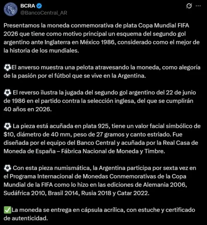 El Banco Central de la República Argentina (BCRA) presentó una moneda conmemorativa de plata dedicada a la Copa Mundial FIFA 2026. La institución autárquica del Estado Nacional optó por inspirar el diseño de la pieza en la jugada del segundo gol de la selección argentina contra Inglaterra, en el histórico encuentro de cuartos de final de la Copa Mundial de México 1986. Sin embargo, el lanzamiento generó una fuerte controversia, ya que en ningún momento de la comunicación oficial se mencionó al autor de aquel icónico tanto, Diego Armando Maradona.