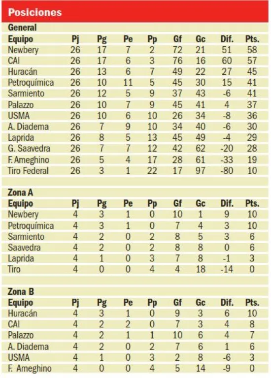 Con esos resultados, Newbery alcanzó la punta de la Zona "A" compartida con Petroquímica, mientras que la C.A.I., al resignar dos puntos, quedó como escolta de Huracán.