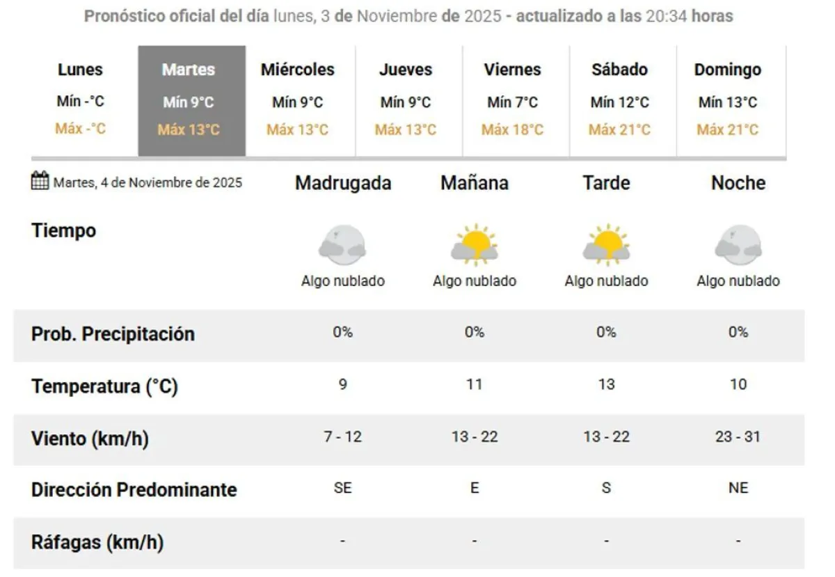 El Servicio Meteorológico Nacional (SMN) emitió su pronóstico para este martes 4 de noviembre, anticipando un día soleado y sin vientos significativos en Comodoro Rivadavia y Rada Tilly.