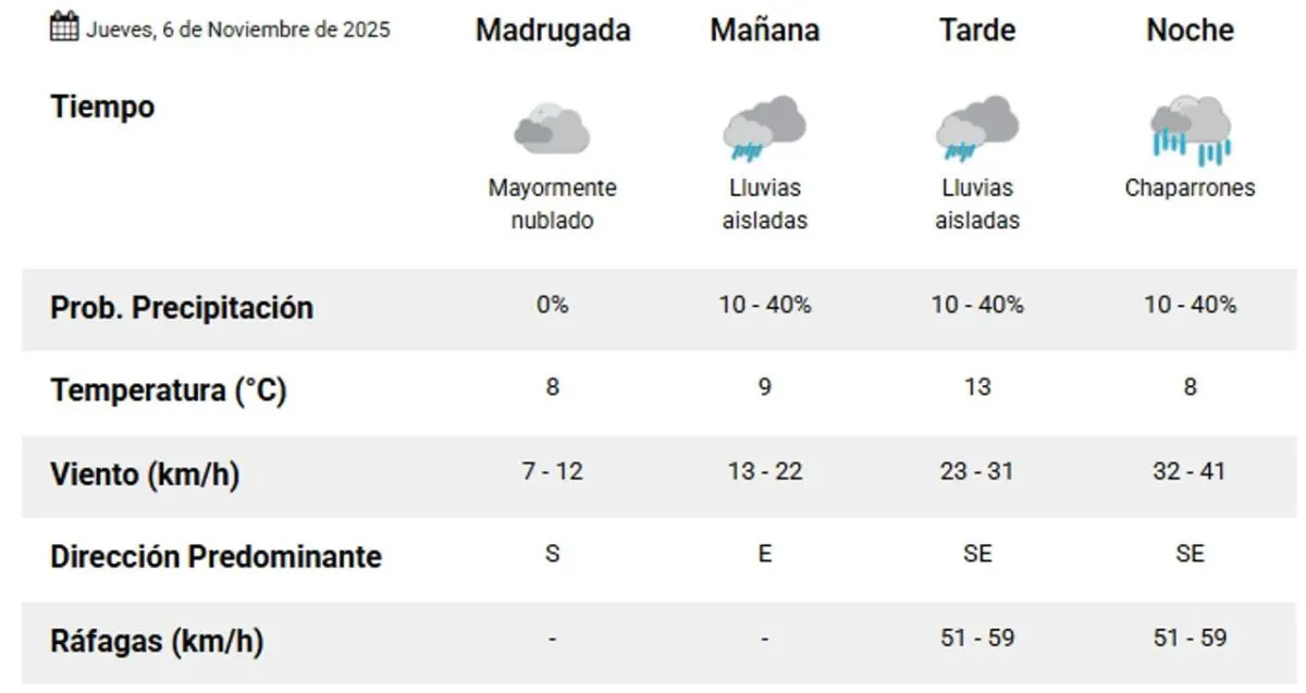 Para el jueves 6 de noviembre, se prevén lluvias aisladas desde la mañana, que continuarán durante la tarde y podrían transformarse en chaparrones al final del día. La mínima se registrará en 8°C y la máxima no superará los 13°C.