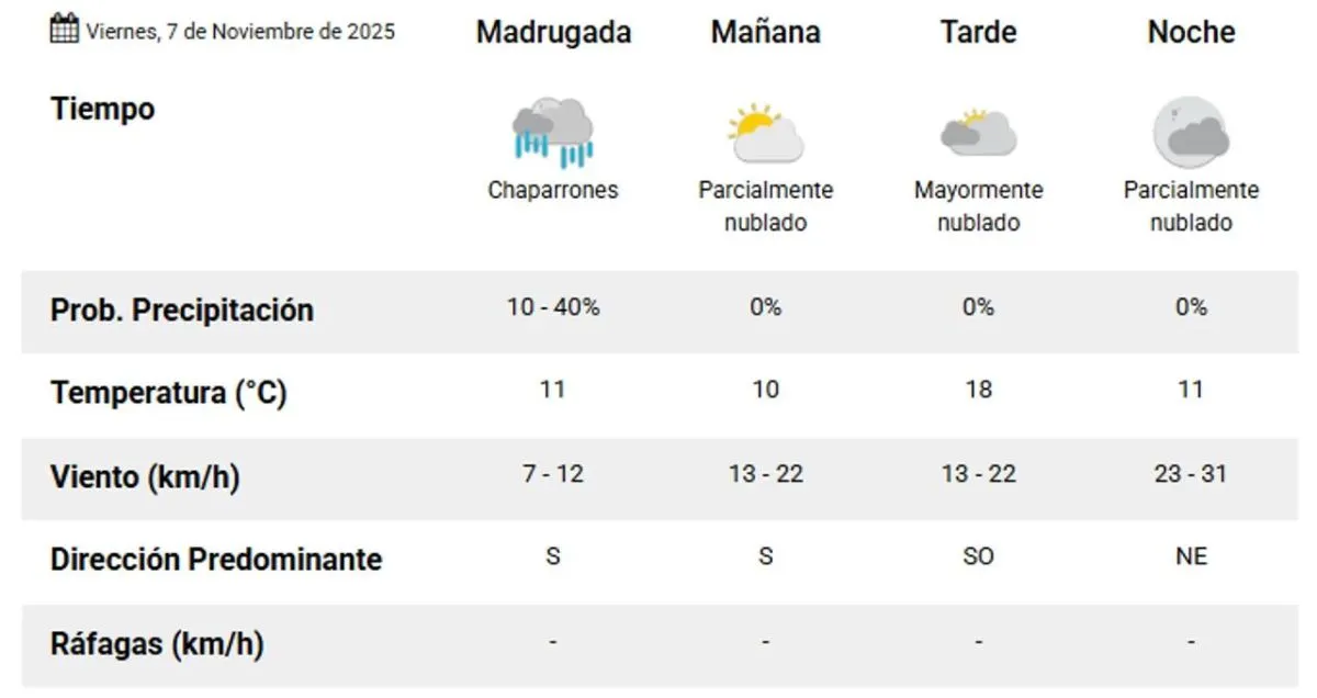 El viernes comenzará con chaparrones y una temperatura de 11°. A medida que avance el día, se espera una ligera mejora, con cielos parcialmente nublados y una máxima que alcanzará los 18° por la tarde, antes de bajar nuevamente a 10° al finalizar el día.