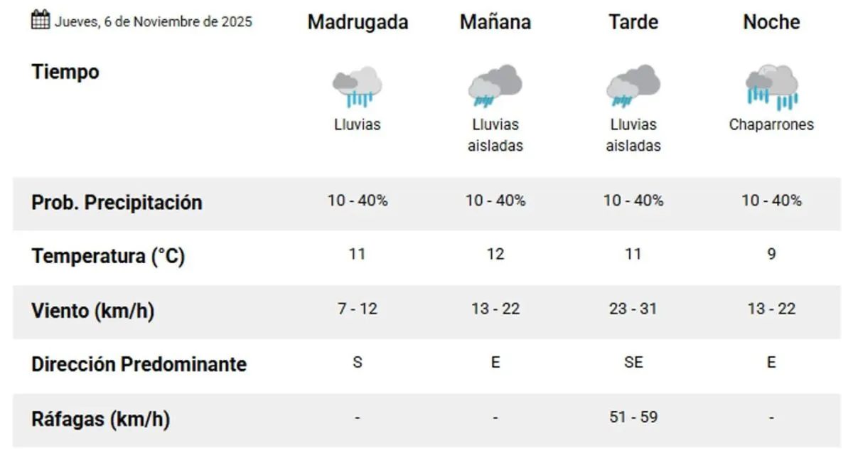 Durante la tarde, se prevén ráfagas suaves del sudeste, con velocidades entre 51 y 59 km/h, y una caída en la temperatura a 11°, manteniendo las mismas condiciones de inestabilidad. Al caer la noche, la temperatura descenderá a 9°, con la posibilidad de chaparrones, pero sin viento.