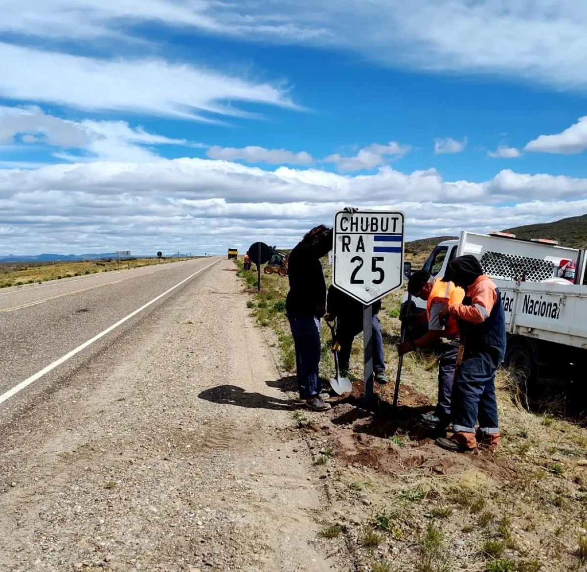 En la RN 25, una cuadrilla de conservación realiza bacheo profundo en la zona de Alto Las Plumas, entre los kilómetros 200 y 207. Otra cuadrilla comenzó con bacheo entre Paso de Indios y Tecka, abarcando los kilómetros 390 y 420.