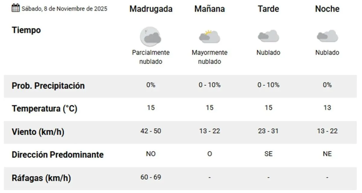 Durante la madrugada, se esperan temperaturas de 15°C, acompañadas por ráfagas moderadas del noroeste, con velocidades entre 60 y 69 km/h. En la mañana, la temperatura se mantendrá en 15°C, aunque el viento disminuirá.