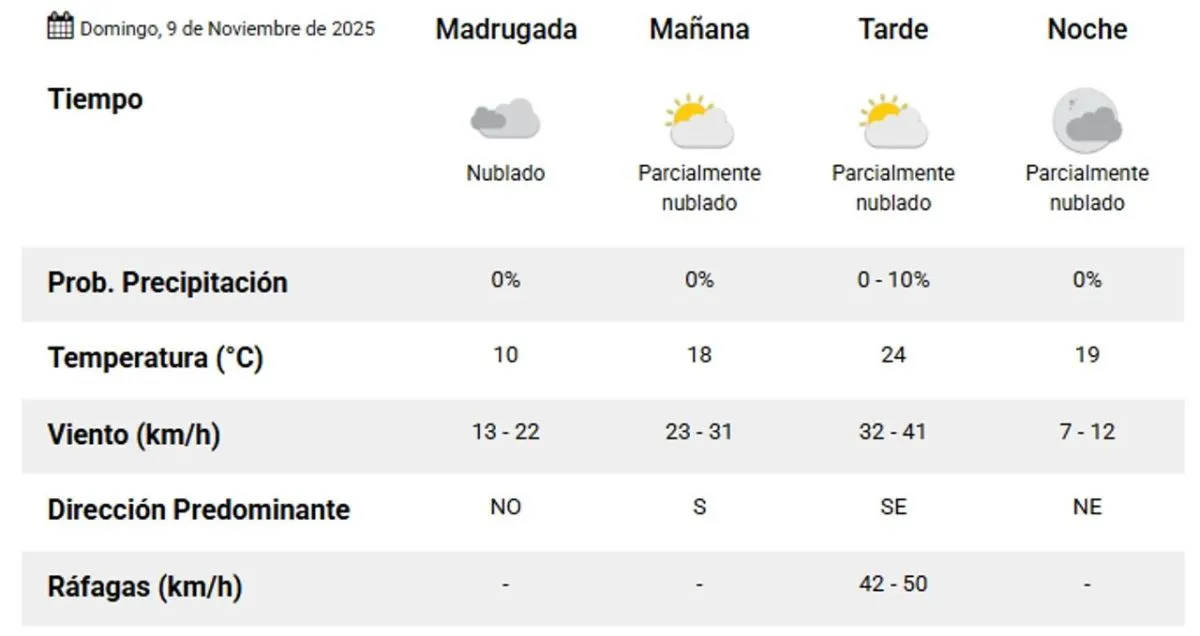 El domingo 9 se prevé un aumento en la temperatura, con un cielo que variará de muy nublado a levemente despejado. La máxima alcanzará los 24°C pasadas las 12 del mediodía, con ráfagas del sudeste de 42 a 50 km/h.