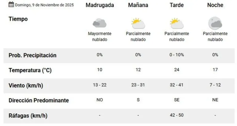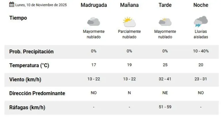 De cara al lunes, la nubosidad variará a lo largo del día, con ráfagas del noreste que podrían oscilar entre 51 y 59 km/h. La máxima será de 25°, y hacia el final de la jornada podrían presentarse lluvias aisladas.