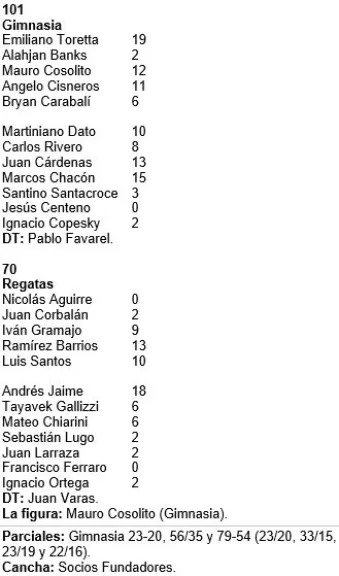 Final del tercer cuarto: Gimnasia 79 - Regatas 54. Sigue tirando con alta efectividad el local y ahí radica una de las diferencias con actuaciones anteriores. Toretta y Cosolito son líderes en el goleo y Banks continúa en el banco.